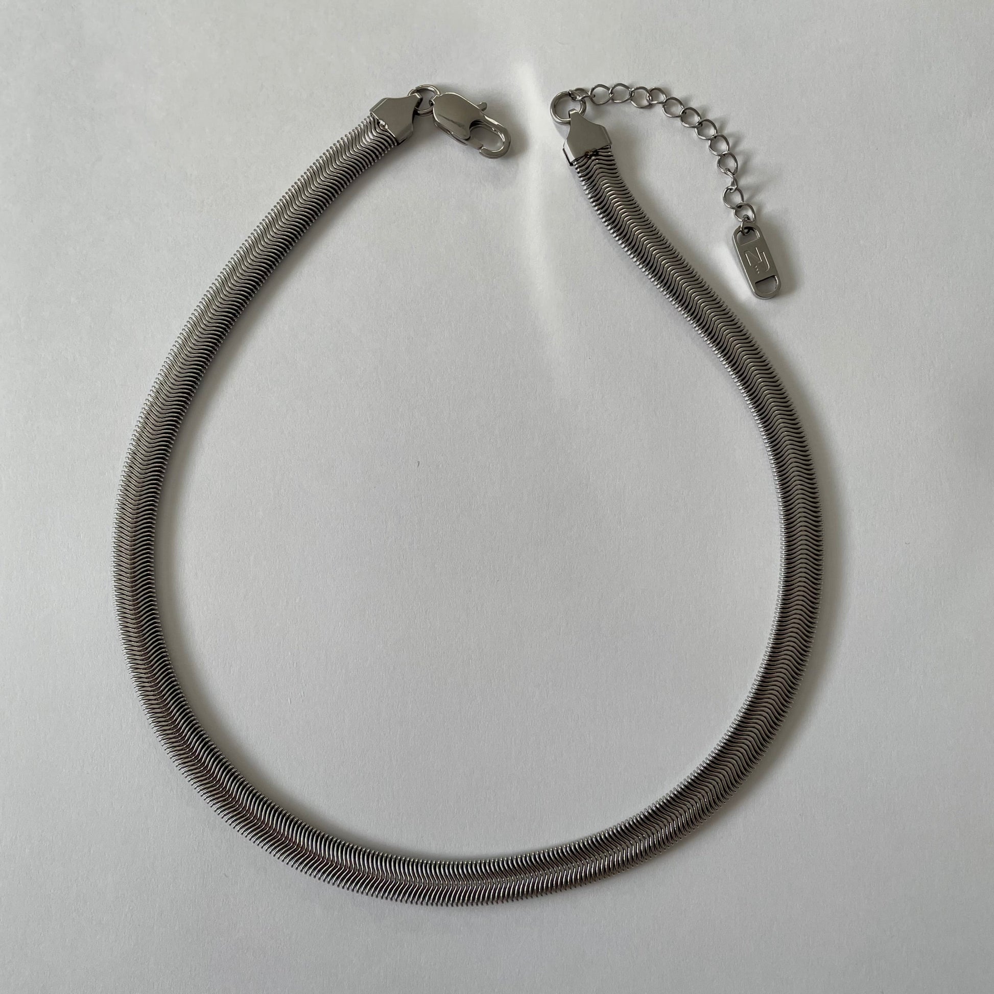 A sleek silver herringbone chain designed to move with you.